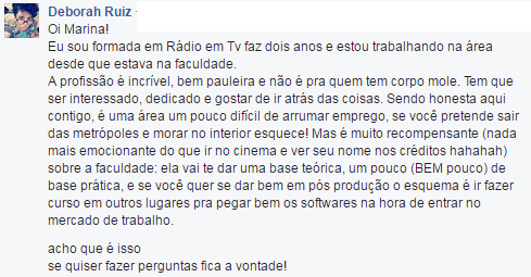 Sou suspeita pra falar, porque eu amei a faculdade e amo essa minha profissão! Achei bem legais as perguntas que recebi, portanto resolvi fazer um vídeo explicando (resumidamente) o que nós fazemos, como é a faculdade e o mercado de trabalho.